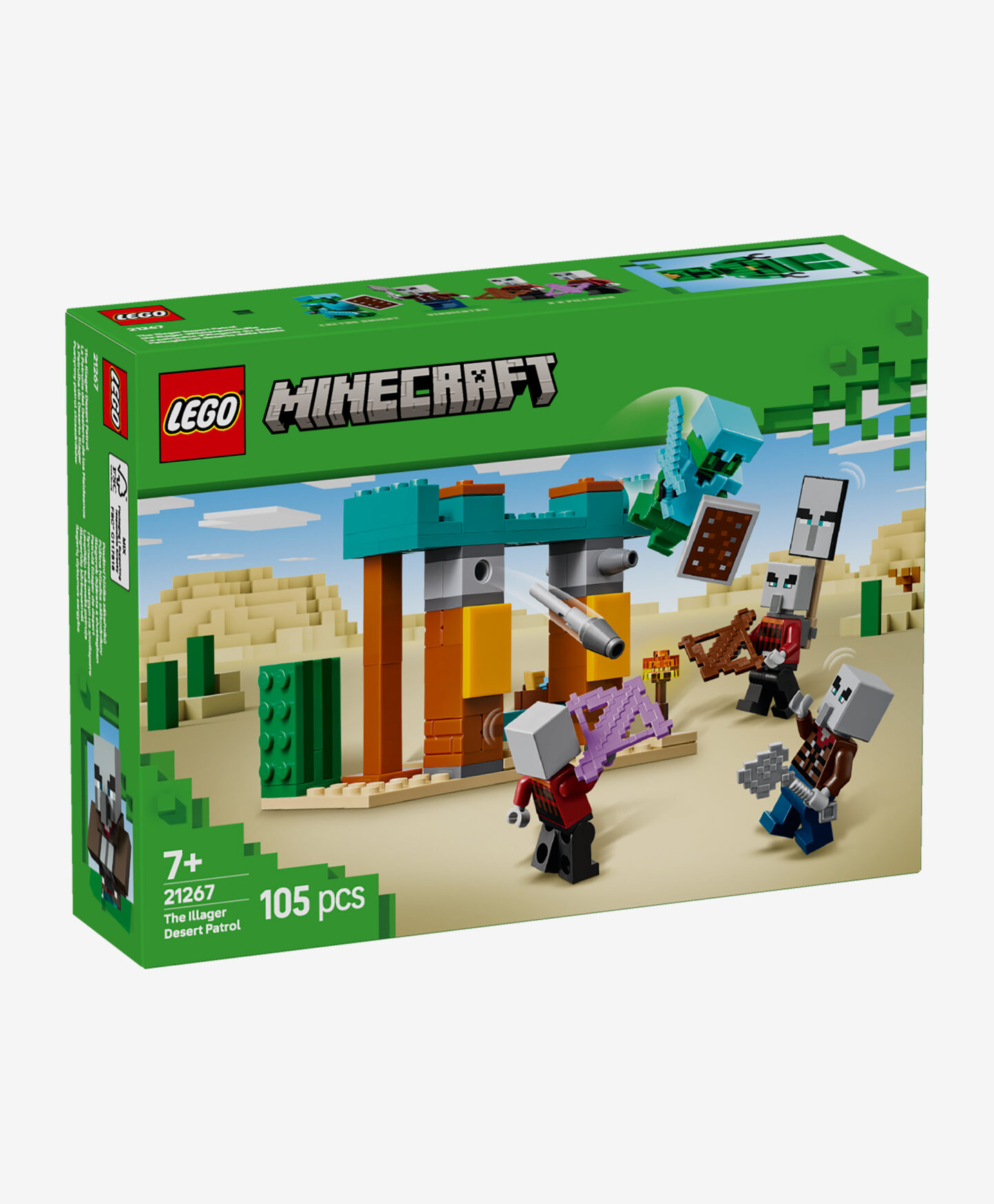 A LEGO® Minecraft Illagerek őrjárata a sivatagban készlet lehetővé teszi a gyerekek számára, hogy elmerüljenek a játék világában és szembenézzenek a veszélyes ellenségekkel. A készlet figurákat és sivatagi tájelemeket is tartalmaz, így újrajátszhatók a harcjelenetek és saját kalandok hozhatók létre.